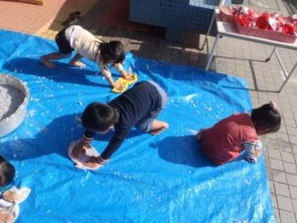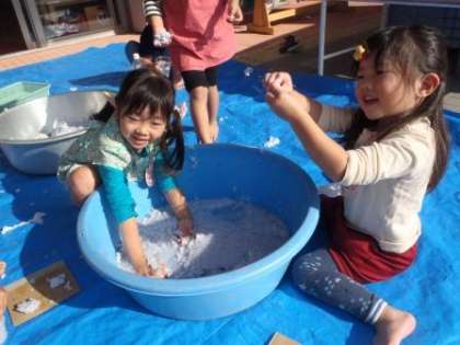 お日様のあたるきもちのいいテラスで,たらいに落とし紙と水をたっぷり入れて遊びました。はじめは大きく四角い落とし紙が,水をかけると魔法のように縮み,柔らかくなることに子どもたちはびっくりです。