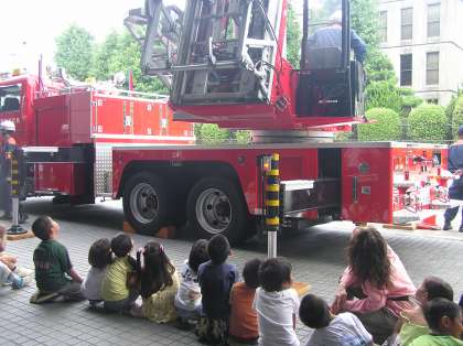 消防署に着いたみつば幼稚園の子どもたちは,まず,消防署の署員さんたちとあいさつ。