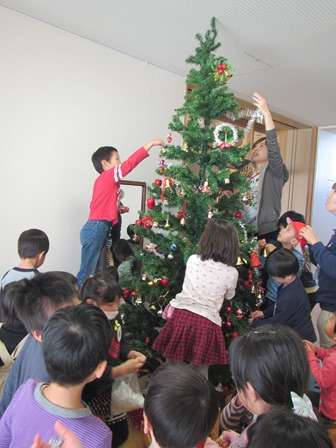 幼稚園のツリーにみんなできれいな飾りをつけました。