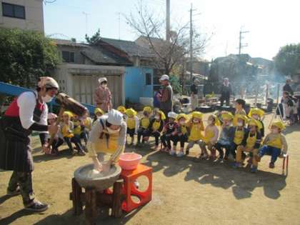 学校運営協議会「みつばの森」、地域の皆さん、PTAの皆さんのお力を結集しての「みつば幼稚園餅つき大会」です。