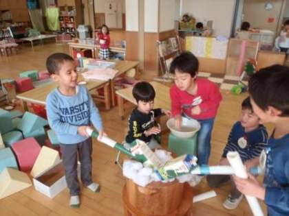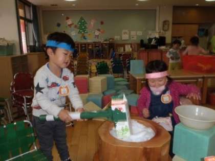 水曜日にもちつきを経験し,3歳児はもちつきごっこを始めました。