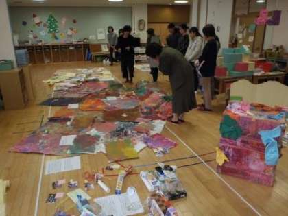 それぞれの園で,楽しみながらかいたりつくったりしたものを持ち寄って,子どもたちの姿を話し合ったり,教材研究をしたりしました。