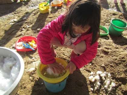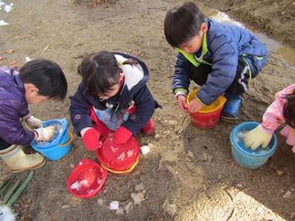 子どもたちは日陰に残る雪を集めてまた違う遊びを始めました。
