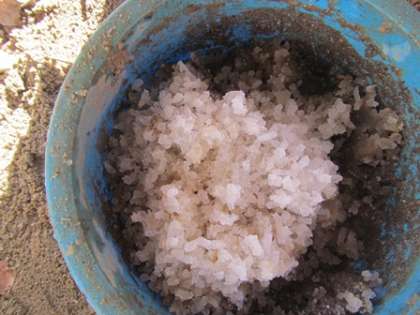 雪の塊を砂ふるいの上にのせて、力を入れてグルグル回します(写真上)