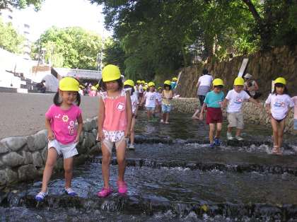3歳児,4歳児は,幼稚園のすぐ近くの堀川へ園外保育に出かけました。