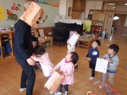 3歳児は先生と一緒に鬼の遊びをするのが大好きです。