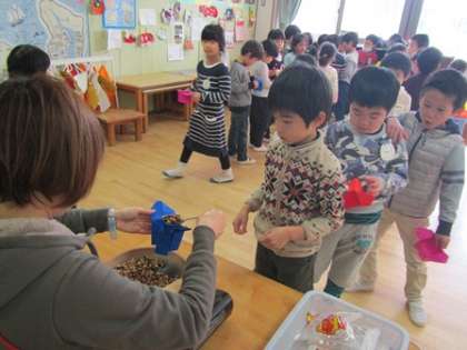 保育室で大豆を煎ると、香ばしいにおいが幼稚園中に漂います。
