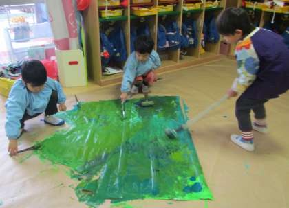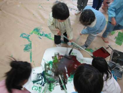 大きな画用紙に、ローラーやはけ、筆などを使って、色をぬっていくと・・・