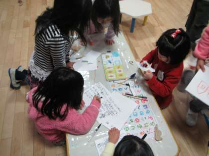 毎日の絵本の読み聞かせや、ロッカーや靴箱などに名前を表記して、文字に触れる環境を整えています。また、年齢や発達段階に合わせて、遊びの中で言葉遊びをしたり、お店屋さんの看板やチケットに字をかいたりして、様々な遊びの中で文字に触れるようにしています。お正月時分によく遊ぶカルタ取りなども、文字に触れるよい機会です。