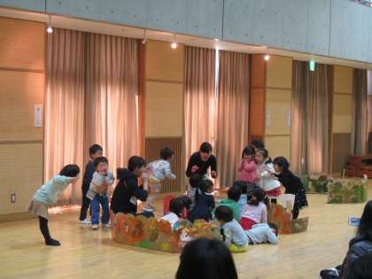 4歳児の劇あそび「三びきのやぎのがらがらどん」では、子どもたちの大好きなあそびを取入れています。こままわしやフープ、縄跳び、一本歯げた。嬉しそうに、得意げな笑顔が見られました。