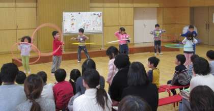 公開保育では、5歳児の子どもたちが、生活発表会での経験をいかし、自分たちで「わくわくどきどき会」というタイトルをつけ、様々な発表をお客様に見ていただきました。(写真上段)