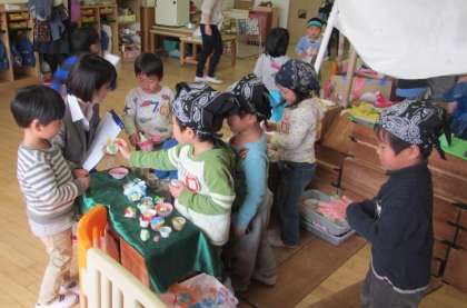 4歳児も、保育室であめやさんやチョコレート屋さんが店開きです。(写真下段)前日まではなかったチューインガム屋さんまでできて、はりきってお客さんを呼び込んでいました。