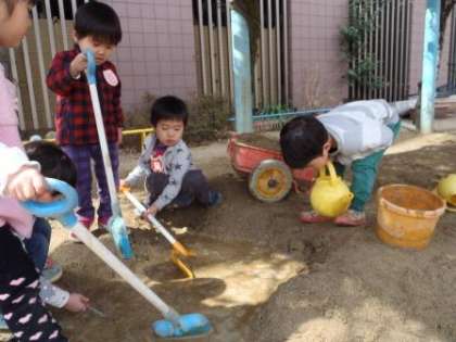 砂場では,3歳児がカステラづくりを楽しんでいました。砂場の穴を大きなお鍋に見立てて,先生や友達と一緒に大きな鍋をかきまぜて楽しんでいました。