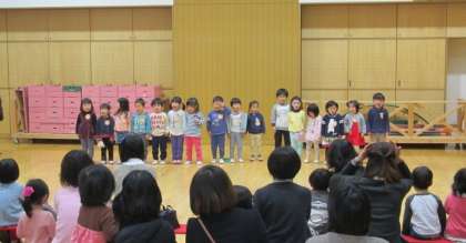 3歳児の子どもたちが、小さな新しいお友達の前で、背中をしゃんと伸ばして歌う姿からは、一年の成長を感じました。