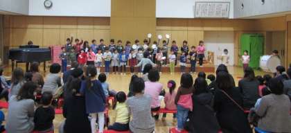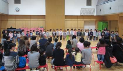 4歳児の子どもたちは「みつば幼稚園のうた」を歌いました。そして、自分たちが年長に進級した時に、入園してくるお友達に、プレゼントを用意していました。