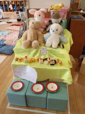 3歳児の保育室の積み木の上に,何やらぬいぐるみが並んでいました。