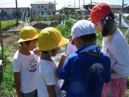 その後,畑の中を探検してカードにかかれた野菜や虫などを探す西賀茂ビンゴゲームを楽しみました。