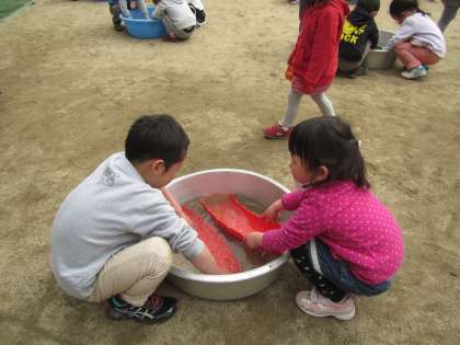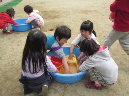 来年度幼稚園にやってくる,新しい年少組さんが,きもちよく砂場で遊べるように,進級したみんなが,また,楽しく砂場で遊べるようにと,一生懸命,ピカピカになるまでおもちゃをきれいにした子どもたちでした。