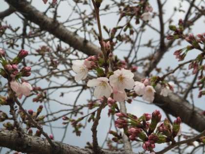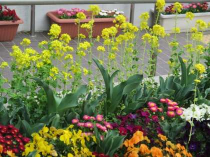 菜の花やパンジーが咲き、チューリップの芽も大きく伸びてきています。