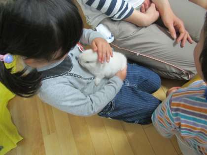 子どもたちは、赤ちゃんウサギをみて、とてもにっこにこです。でも、静かな声で話しています。きっと、赤ちゃんだから大きな声で話すとびっくりすると思っているのでしょう。子どもたちの優しい気持ちがうかがえました。