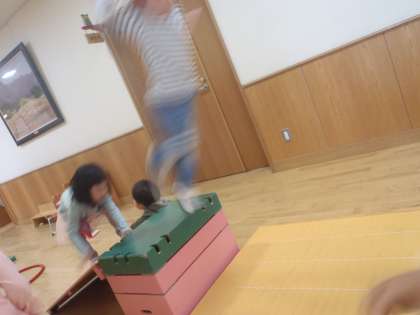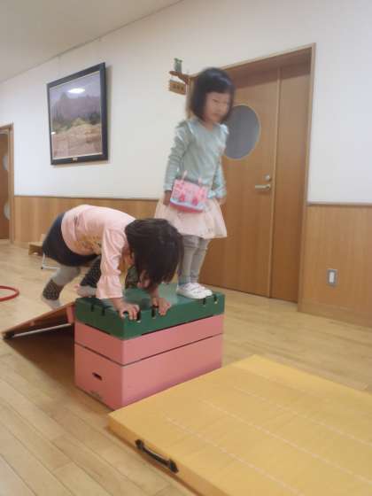 年少組の部屋の前の廊下に,坂道やジャンプ台をつくると,次々とのぼって,ジャンプ!