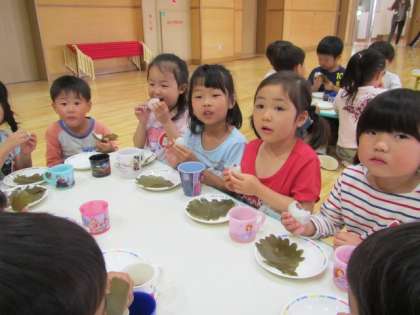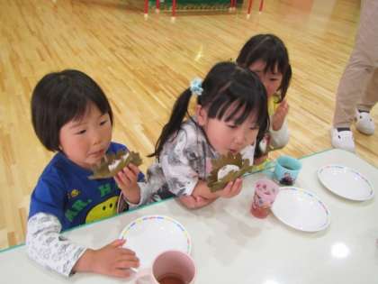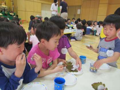 「おいしいね」と友達とニコニコと話をしながら食べている子どもの姿もあり、みんなでおいしく柏餅をいただきました。