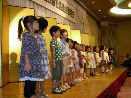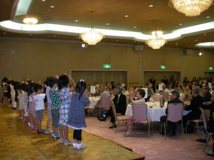 子どもたちは,幼稚園のおじいちゃん・おばあちゃんお招き会で大勢のお客様の前で歌った経験はありましたが,ルビノ京都堀川のホールにあまりにも多くのお客様がいらっしゃることや金屏風の前にライトを浴びて立つということでちょっぴり緊張気味でした。でも元気いっぱいに“お日様パワー”で踊ったり,手遊びをしたり,「トンボのめがね」の歌を歌ったりしてたくさんの拍手をいただき,嬉しそうでした。
