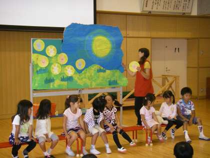 十五夜お月様のお月見だんごを子どもたちがつくって,「あーおいしい!」と味わいました。この日もまん丸お月様が可愛いお誕生ウサギさんを見守ってくれていました。