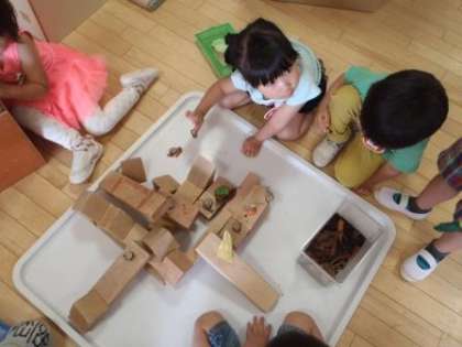カタツムリが遊べる場をつくりたい!ということで,小さな積み木で滑り台やトンネルをつくりました。