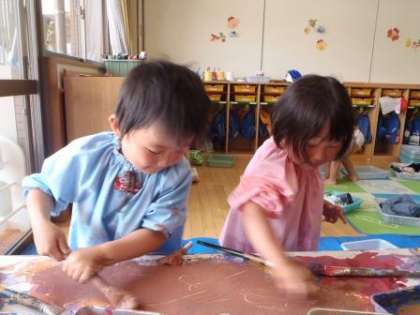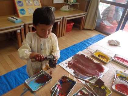 4歳児ばら組で,絵の具遊びをしました。