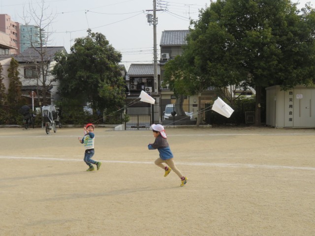 広い園庭に駆け出しました。今日はとてもいい風が吹いています。どんどん揚がる凧に大喜びの子どもたち。