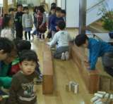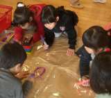 4歳児のばら組をのぞくと,いくつも楽しそうなグループができています。 段ポール...