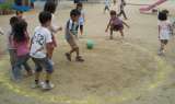 4歳児のばら組がころがしドッジをしています。 でも,ふつうのドッジボールとは少し...