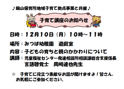 鶴山保育所と共催の地域子育て支援事業として,12月10日(月)10:00〜11:...