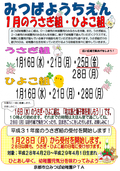 平成31年1月のひよこ組,うさぎ組の案内です。 16日には,和太鼓と獅子舞を観ま...