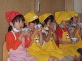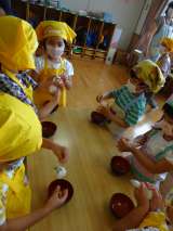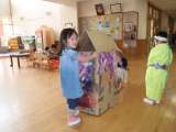 年長さんからもらったチケットを手に豆ごはんパーティーにやってきた子どもたち。 ...