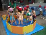 3歳児のたんぽぽ組ともも組はクラスの前にビニールプールを出して水遊びを楽しんでい...