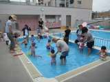 7月26日 教育相談ひよこ組はプールで遊びました。 バケツやひしゃくで水をすく...