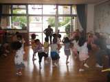 4歳児ばら組が,明日の祖父母参観で踊る「こんちゅうたいきょくけん」を3歳児もも組...