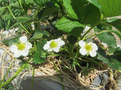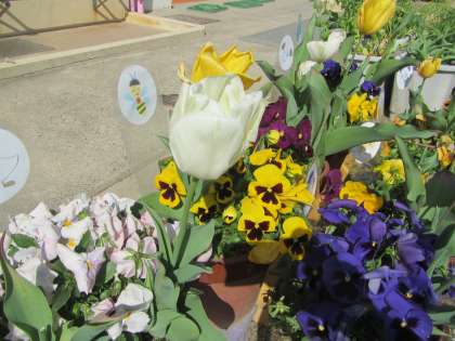 園庭の色とりどりの花の中に,白い花が…。さて,何の花か,わかりますか…。あとから,おいしいものができる花もありますよ。幼稚園のお庭で,探してみてね。