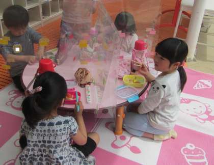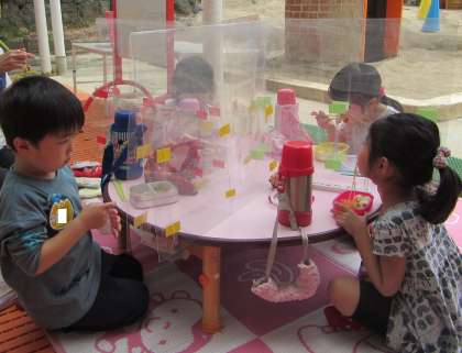はな組(年少児)は,心地よい風に誘われて,テラスでランチをしました。普段は机に二人ずつ座っているのですが,今日は丸テーブルなので「みんな顔が見える!」と嬉しそうでした。シールドが4枚あるので「こっちもこっちも見える!」「風車みたいやなあ」「くるくる回ったらどうする?」とみんなの笑顔を見ながら,おいしく食べることができました。今度はどこでランチしようかな。楽しみですね!