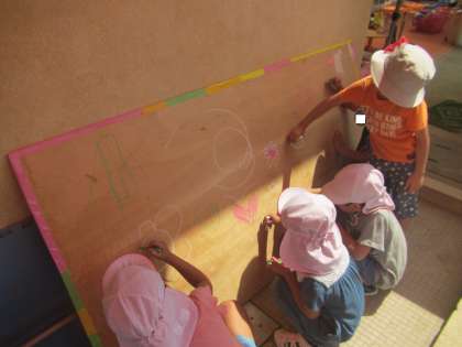 ある日…,みんなでらくがき大会をしました。思いっきりらくがきしたら,大雨がやってきて洗い流してくれて,大掃除の時にも,きれいに消して後始末もばっちりでしたね。たのしい待賢幼稚園!