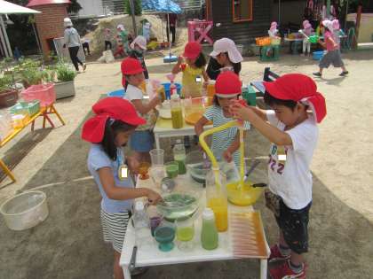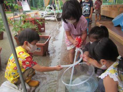 昔よく使ったちょっとレトロ?なポンプで遊んでいます。水遊びから色水遊びにも使って,さまざまに試す姿があります。電気も使わずに手の力で道具を扱って,どんどん色水が出てくる面白さ,吸い込まれる不思議…。ボタン一つで何でもできることが増えてきましたが,自分の手で道具を操ることで,様々な仕組みや感覚に気付いていきます。面白いことは,身の回りにいっぱいありますね。