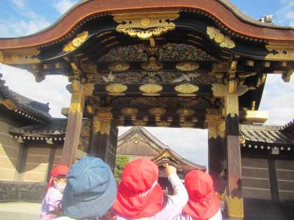 はな組だけで,二条城までお散歩に行きました。かばんや,たからさがしビンゴゲームのカードをつくって,準備はばっちり!道中は,交通安全についてしっかり意識をもって歩いていました。二条城に入ると,たからさがしスタート!お目当ての唐門のチョウチョやツルも見つけました。