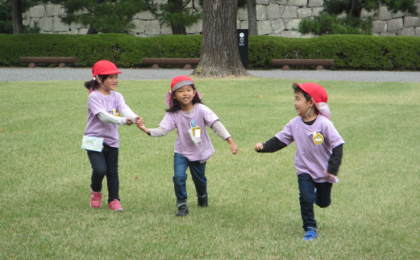 芝生広場では,ばなな鬼をしたり,でんぐりまわりをしたり,思いっきり走ったりして遊びました。スダジイやいろいろな落ち葉も拾って,大事にマイかばんにいれました。