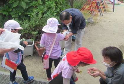 いつも遠足に行かずに,お見送りばかりで,お留守番してくださっている用務員さん,事務員さんにどんぐりのお土産を渡しました。「ありがとう」って言ってもらって,嬉しそうでした。楽しく嬉しいはな組だけの遠足でしたね。