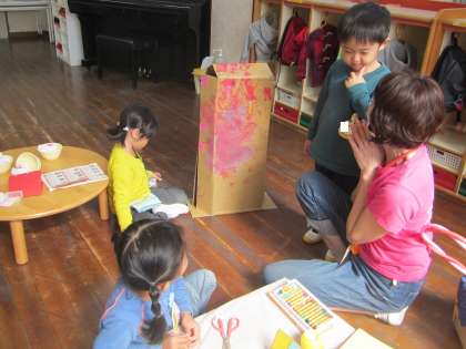 はな組さん,なにやらひみつの相談のようです…。なんだか,楽しそう…。さて,何かな…。お楽しみに…。