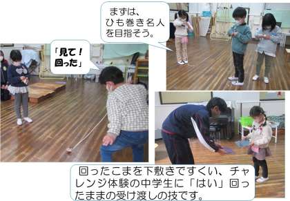 お年玉にもらったこま。簡単にはできないところが、ことり組の力の出しどころです。繰り返し取り組んで、少しずつコツをつかんできました。