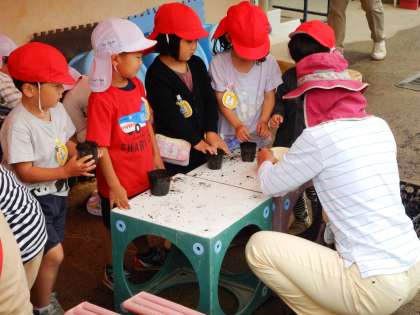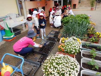 朝から種まきをしました。とてもとても小さな種をひとつひとつていねいに植えていきます。たくさん種類があったので、子どもたちも種類ごとに、まちがえないように、と両手で大切に運んでいました。