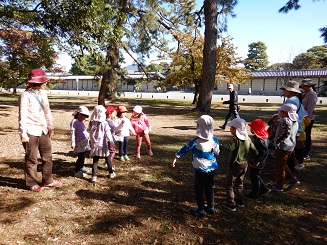 今日は4歳児はな組と5歳児ことり組で京都御苑に行ってきました! どんぐりや落ち葉などの秋の宝物をいっぱい見つけたり、だるまさんがころんだや花いちもんめをして体を動かして遊んだりと楽しみました。